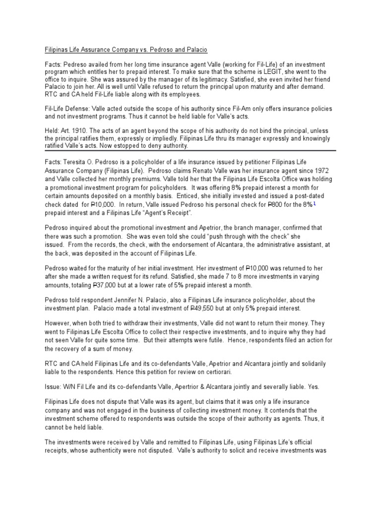 Filipinas Life Vs Pedroso And Palacio Law Of Agency Civil Law
